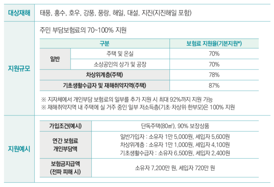 - 국가와 지자체에서 보험료를 지원하는 정책보험으로 예기치 못한 풍수해나 지진으로부터 재산 피해를 실질적으로 보상받을 수 있도록 지원
