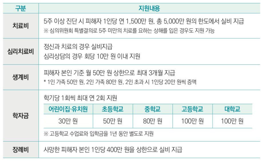 - 검찰청에 직접 신청 또는 경찰·군검찰·범죄피해자지원센터 추천 → 검찰청 경제적 지원심의위원회 결정을 통해 지원