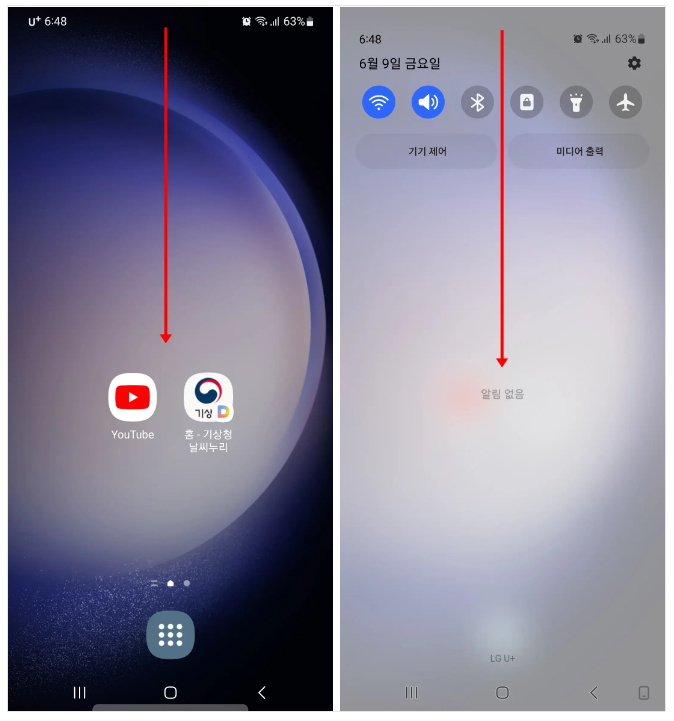 1) 상단의 갤럭시 상단바를 아래로 두번 내립니다.