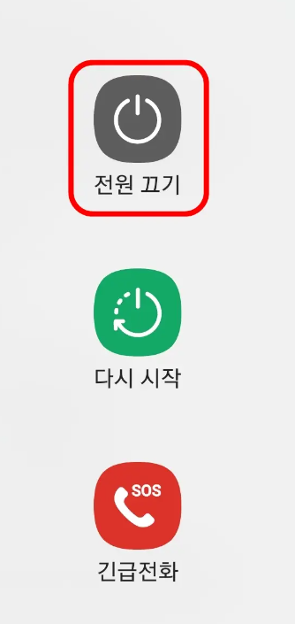 측면 버튼과 볼륨 버튼을 동시에 길게 누르면 하단과 같은 화면이 나타나며, 전원 끄기를 누르면 전원이 꺼집니다.