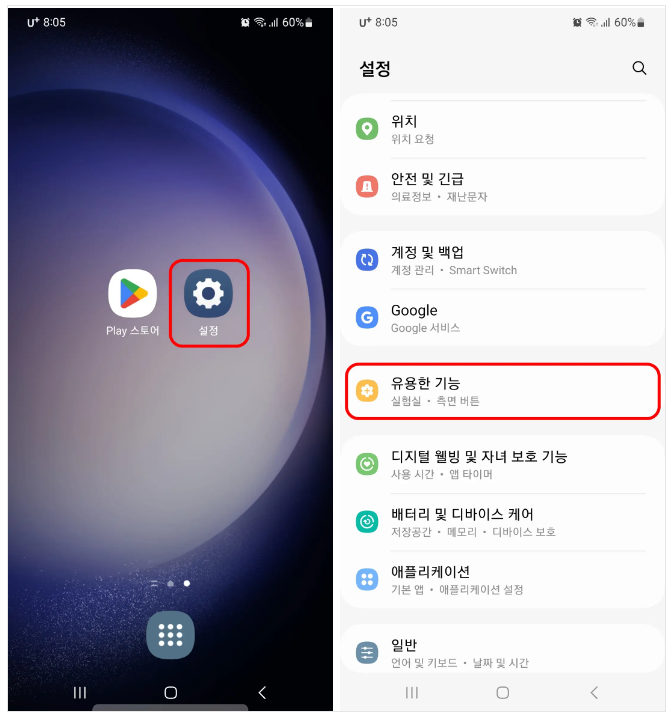 1) 설정 아이콘 클릭 후 유용한 기능 메뉴를 클릭합니다.