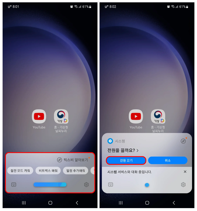 빅스비 음성 호출 후 전원 꺼줘라고 말 하게되면 전원을 끌까요? 라고 응답을 하게 됩니다. 이때 전원 끄기라고 말 하거나 전원 끄기 버튼을 클릭하면 전원이 꺼지게 됩니다. 참고로, 하이 빅스비 전원 꺼줘라고 한번에 말을 해도 됩니다.