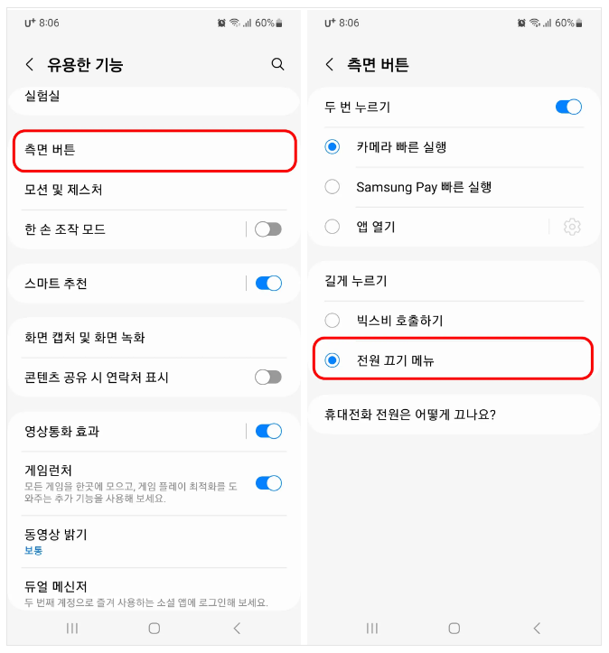 2) 측면 버튼 메뉴 클릭 후, 길게 누르기를 전원 끄기 메뉴로 변경한 후 측면 버튼을 길게 누르면 전원을 끌 수 있습니다.