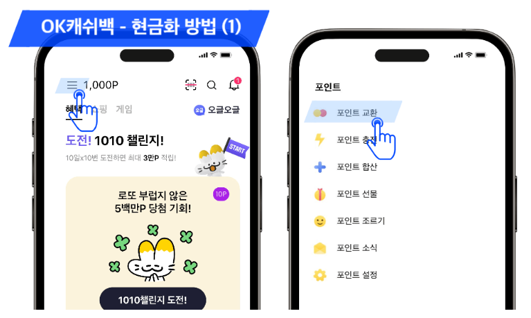- 제휴사 포인트 > OK 캐쉬백 포인트로 전환