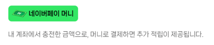 네이버페이 머니란 사용자가 충전한 금액을 말합니다. 또한, 네이버페이 머니로 결제 시 포인트 추가 적립이 가능합니다.