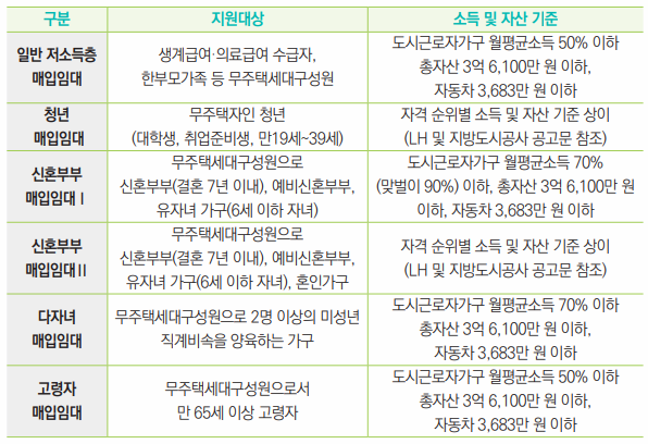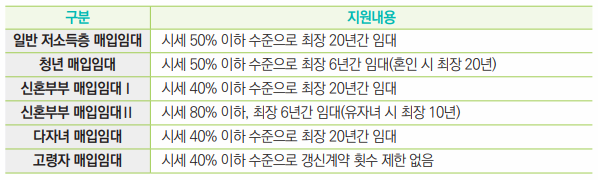 - 다가구주택·다세대·연립주택, 아파트 등을 LH 또는 지역별 지방 도시공사에서 매입하여 저렴하게 임대