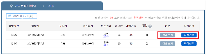 6) 출발시간을 확인 한 후 좌석선택을 클릭합니다.
