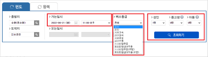 5) 출발 일시, 시간 등을 선택한 뒤 조회하기를 클릭합니다.