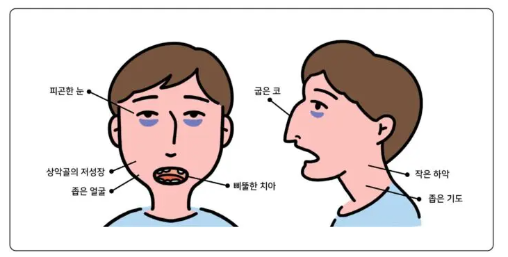구강 호흡은 얼굴 구조에 영향을 미치게 됩니다. 공기가 입으로 들어가게 되면 공기의 통로를 만들기 위해 혀가 입천장에 있지 않고 아래로 쳐져 뒤로 위치하게 됩니다. 혀가 입천장에 있지 않으면 위턱이 좁아지고 앞니가 돌출되어 뻐드렁니가 되며 아래턱은 성장하지 못해 무턱처럼 변형되며 얼굴이 길어지게 되는데, 이를 아데노이드형 얼굴이라 부르며 코 뒤쪽과 목 사이에 있는 편도의 일종인 아데노이드가 비대해지면서 생길 수 있지만, 습관적으로 입 호흡을 하면서 생길수도 있는 얼굴 변형의 종류입니다.