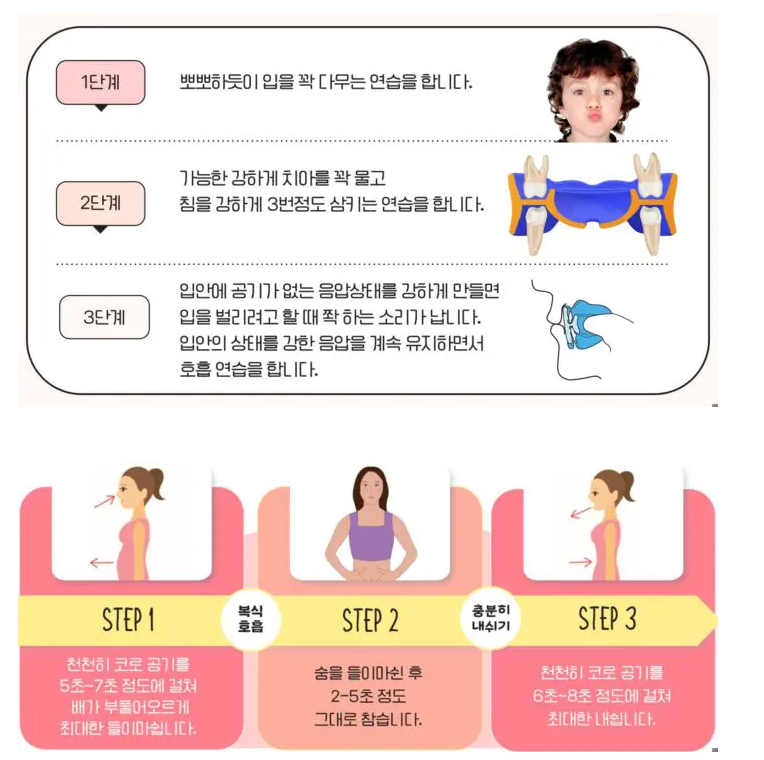 공기는 들이마시는것도 중요하지만, 내뱉는 과정도 중요합니다. 공기가 입으로 들어갔다 입으로 나오면 입안이 건조해지는데, 입안이 건조해지면 음식 찌꺼기가 치아와 붙어 치석이 잘 생기게 되며 잇몸질환을 키울 가능성이 높아집니다. 코로 호흡을 잘 하기 위해선 평상시 연습이 필요합니다. 부모들 중엔 아이가 잘때, 입을 벌리지 못하게 입술에 테이프를 붙이기도 하지만 이는 기도를 막을 수 있기 때문에 위험한 방법입니다. 코로 호흡을 잘 하기 위해서는 입술을 다물게 하는것도 중요하지만, 혀가 앞쪽에 위치해 입천장에 붙어있도록 하고 목젖과 연구개가 앞쪽으로 혀와 붙어있는 상태를 만들어야 합니다.