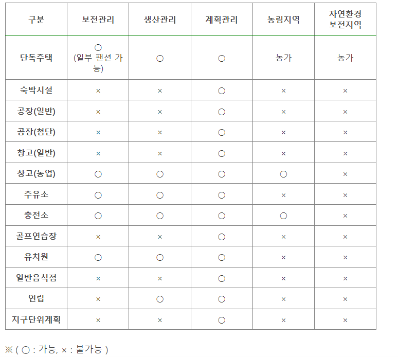 계획관리지역의 가장 큰 특징은 다른 비도시지역과 다르게 수익사업의 대표적인 건축물의 종류인 일반 음식점, 모텔, 영업용 창고, 공장, 골프 연습장, 주유소 등을 건축할 수 있으며, 하단과 같습니다.