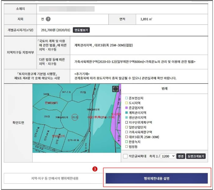 3) 해당 토지의 지목, 면적, 용도지역 등 토지이용계획 열람이 가능하며, 우측 스크롤바를 조금 내린 후 중간에 행위제한 내용 설명 메뉴를 클릭하면 건축법에 따른 해당 필지에서 건축 가능한 건물의 종류 확인이 가능합니다.