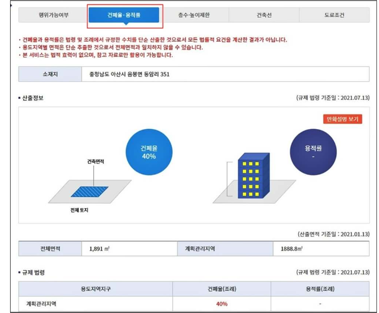 4) 추가로 행위 가능 여부 메뉴 옆 건폐율 • 용적률, 층수 • 높이제한, 건축선, 도로조건 메뉴를 각각 클릭해보시면 해당 내용을 아주 직관적이고 매우 간편하게 열람이 가능합니다. 매우 유익한 사이트이니 한번씩 방문 해보시길 바랍니다.