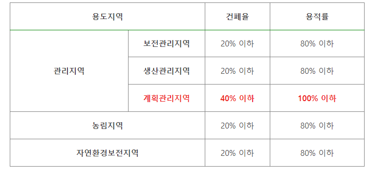 계획관리지역은 비도시지역 (관리지역, 농림지역, 자연환경보전지역) 중에서 가장 높은 건폐율과 용적률로 건축이 가능합니다. 국토계획법 시행령에서 정하고 있는 비도시지역의 건폐율과 용적률을 비교하면 하단과 같습니다.