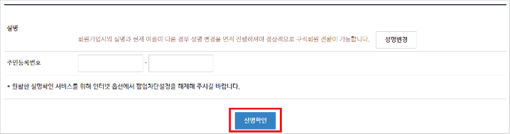3) 실명확인정보 처리 동의 후, 성명과 주민등록번호를 입력한 뒤 실명확인을 합니다.