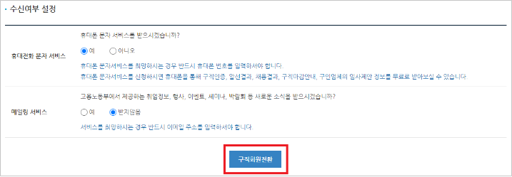 5) 휴대폰 문자 서비스/메일링 서비스 수신여부 확인 후 구직회원전환 버튼을 클릭합니다.