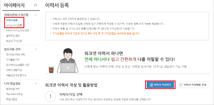 6) 이력서와 자기소개서를 등록합니다.