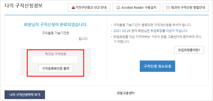 나의 구직신청관리 메뉴에 접속하면 구직등록확인증을 바로 출력 할 수 있습니다.
