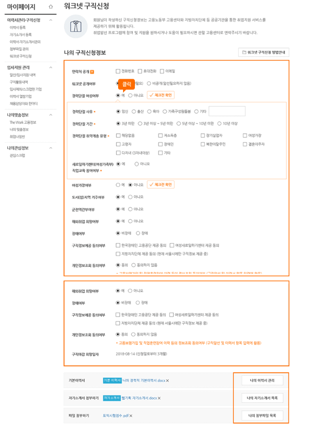 8) 필요한 정보 입력 후 이력서와 자기소개서를 첨부한 뒤 구직신청 버튼을 클릭하면 구직신청이 완료됩니다.
