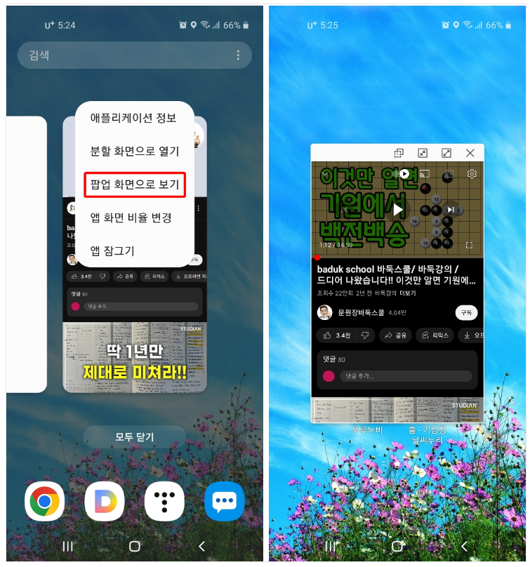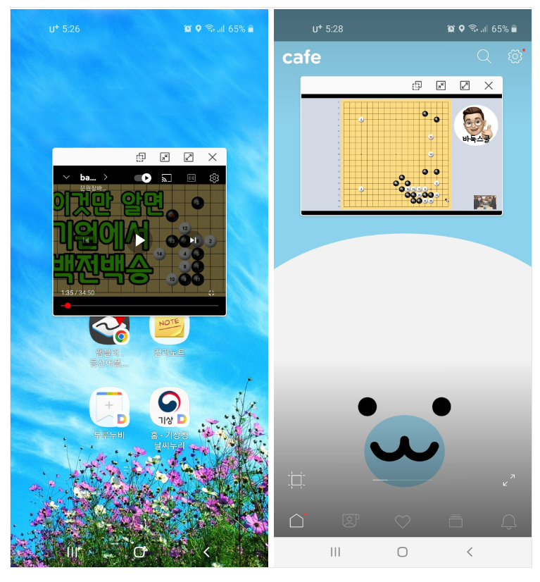 3) 유튜브 화면을 손으로 드래그해서 위치 변경, 크기 축소, 확대, 크기 조절 등이 가능합니다.