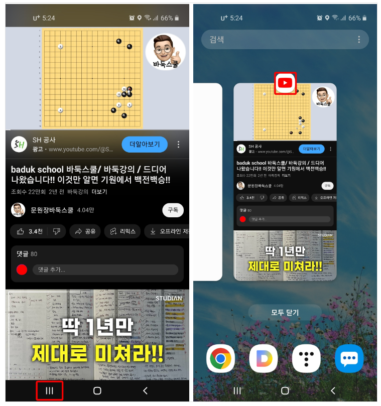 1) 시청하고 싶은 동영상을 실행 후 백그라운드를 누른 뒤 유튜브 아이콘을 클릭합니다.