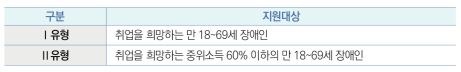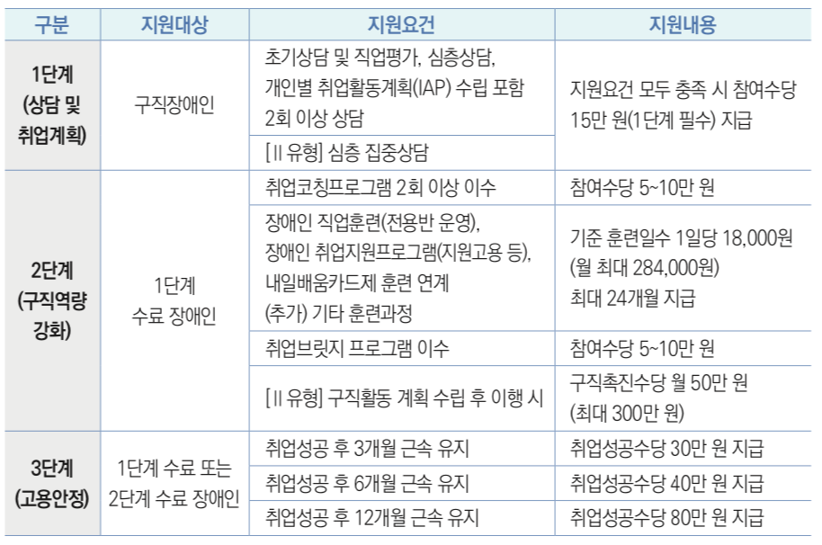 - 장애인의 취업경쟁력을 높이기 위한 취업 지원사업으로 만 18세 이상 69세 이하의 장애인이 참여할 수 있습니다. 상담을 통한 진로 설계, 취업계획 수립(1단계), 구직역량 강화(2단계), 고용안정(3단계)의 단계마다 참여(훈련) 수당도 지원받을 수 있습니다.