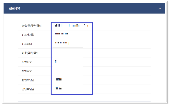 • 민감한 상병 및 사생활 침해의 우려가 있는 정신과, 산부인과, 비뇨기과 등의 상병은 제공되지 않으며 열람 및 발급을 원하시는 경우 신분증을 지참하시고 가까운 공단 지사에 방문하시면 가능합니다.
