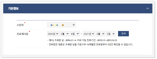 상단의 검색창에서 진료받은 내역 검색 후 조회하기를 클릭합니다.