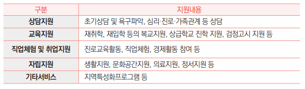 • 상담 치료(정신의학적 상담), 보호(거주형 보호시설), 교육(검정고시 지원), 자립지도 (직업교육, 체험활동 등) 지원