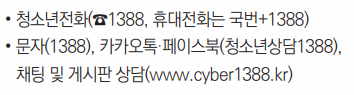 - 청소년상담전화 또는 청소년 상담복지센터 방문 상담