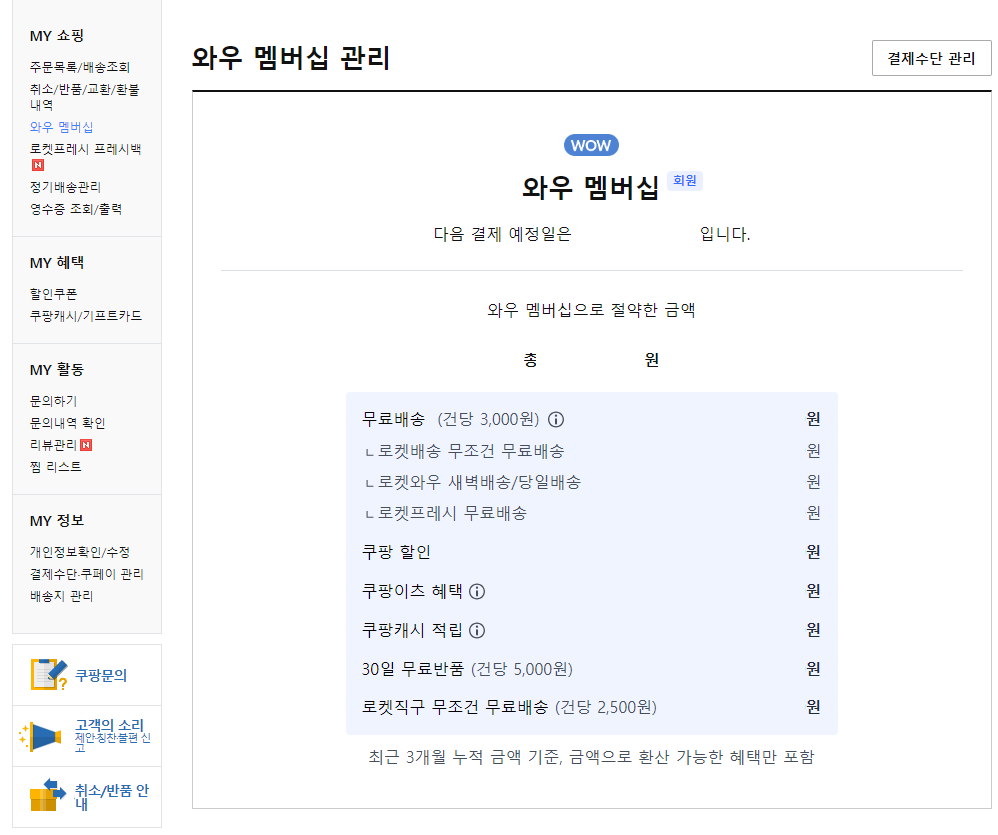 유료 구독 서비스인 로켓와우 멤버십은 쿠팡에서 여러가지 혜택을 제공하는 월정액 회원제 서비스로, 누구나 30일 동안 무료체험 이후 월 4,990원의 가격에 쿠팡 로켓와우 멤버십 서비스를 이용할 수 있습니다. 매달 결제는 쿠페이에 등록된 결제수단(계좌이체, 카드) 으로 자동 결제가 진행되며 결제일은 가입일과 동일한 날짜에 결제가 매달 이루어집니다.