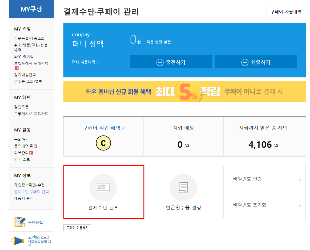 2) 로그인 후 마이쿠팡 메뉴를 클릭하신 뒤 결제수단을 클릭 후 결제수단(신용카드, 계좌이체 등)을 등록합니다.