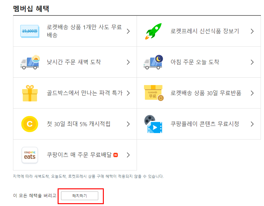 4) 멤버십 해지도 동일하게 마이쿠팡 > 와우 멤버십 > 해지하기 버튼을 통해 해지 신청이 가능합니다.