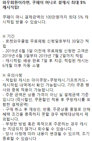 로켓와우 회원 신청일로부터 30일간 결제금액의 100만원까지 최대 5% 캐시적립을 받을 수 있으며, 30일이 지난 후에는 1% 적립 혜택이 적용됩니다.