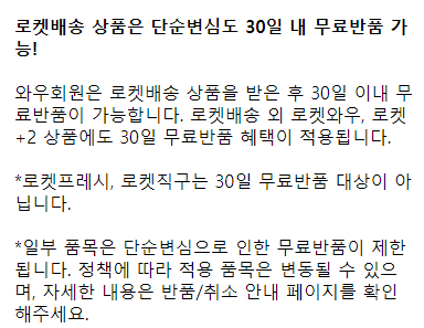 로켓와우 회원은 로켓배송 상품을 수령한 뒤 30일 이내 무료 반품이 가능합니다. 상품에 따라 적용이 불가능한 경우도 있지만 로켓배송, 로켓와우 뱃지가 적용되어 있는 상품은 가능하며 로켓프레시, 로켓직구 상품은 경우에 따라 불가능한 경우가 발생합니다.