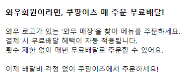 쿠팡와우 회원은 주문 횟수, 주문 금액, 장거리 배달 제한이 없으며 음식 주문 시 무료배달, 한집배달 중 무료배달을 선택 후 이용하시면 배달비를 내지 않을 수 있습니다.