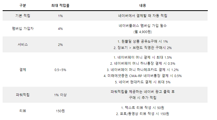 그렇다면, 네이버 페이를 이용하면 포인트는 얼마나 적립할 수 있을까요? 기본 적립 및 포인트 적립은 하단과 같습니다. 더불어, 네이버 플러스 멤버십 가입 시 월 4,900원으로 월 최대 4%까지 추가 적립이 가능합니다.